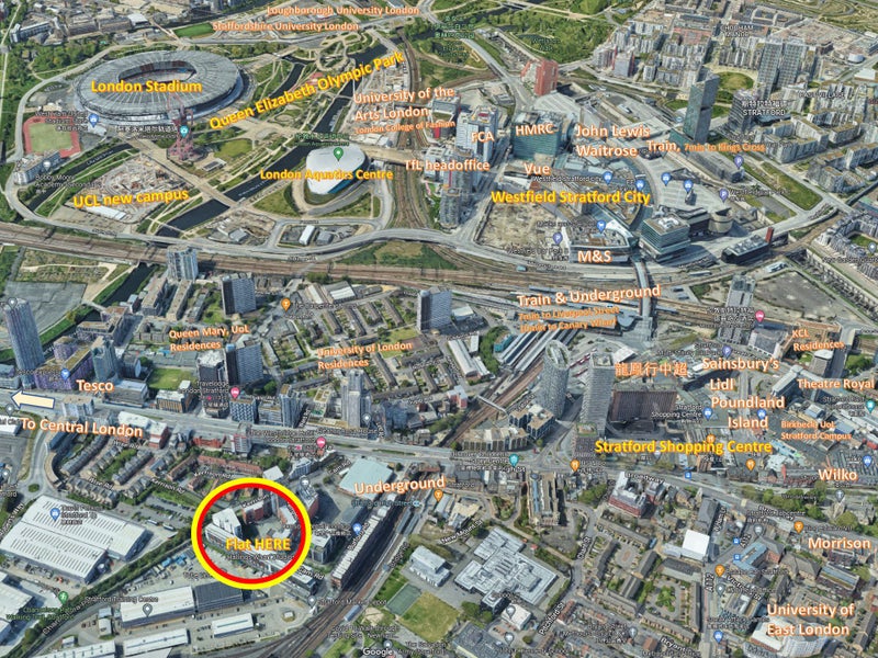 Stratford is the largest shopping zone in Europe, together with the Westfield and Stratford Shopping Center. You can purchase anything here and enjoy the great entertainment such as the restaurants, bars (Roof East), cinema (Vue Westfield), theatre (Theatre Royal Stratford East), and casino (Aspers Casino Westfield). There are big Morrisons, big M&S, big Waitrose, big Sainsbury, big Chinese supermarket (Loon Fung Stratford), big Poundland, big Iceland, and big Wilko near the flat.