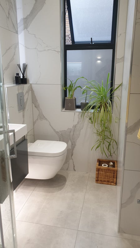 BATHROOM: Shower cubicle, toilet, sink and towel radiator