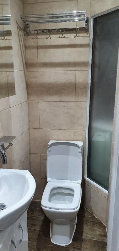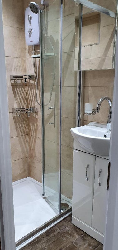 The bathroom is fully tiled with a good electric shower.