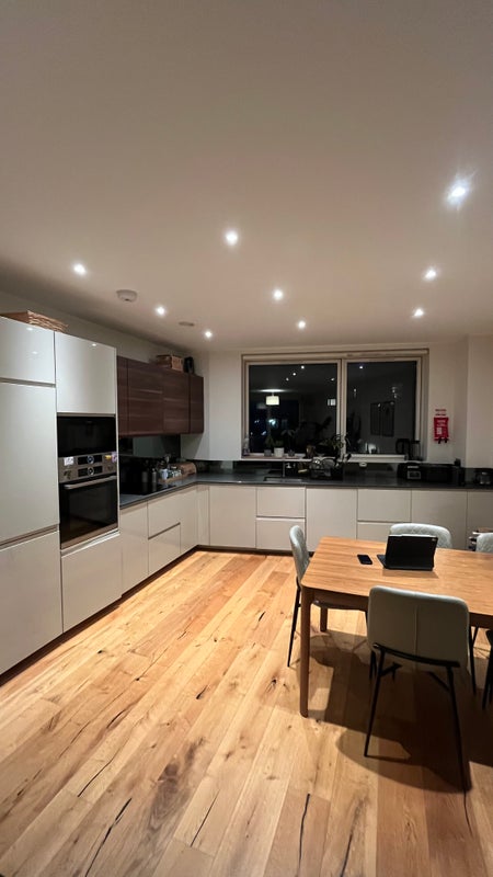 The flat has a very large open-plan living room and kitchen, which makes the whole space feel bigger than it already is. There’s a dining table for six, a comfortable sofa, and plenty of room to relax, socialise, or work from home.