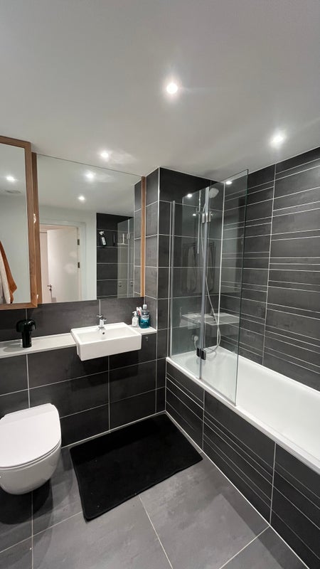 The shared bathroom is spacious and modern, finished with high-quality fittings and underfloor heating.