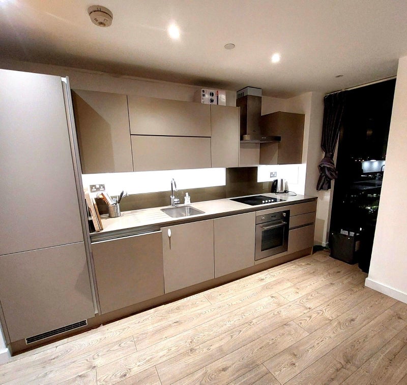 Positioned on a high floor, this beautifully presented apartment features a bright and spacious open-plan living and dining area with floor-to-ceiling windows, allowing natural light to flood the space while showcasing spectacular views towards Canary Wharf and the City. The sleek modern kitchen is fully integrated with high-spec appliances and premium finishes, ideal for both everyday living and entertaining.