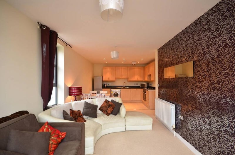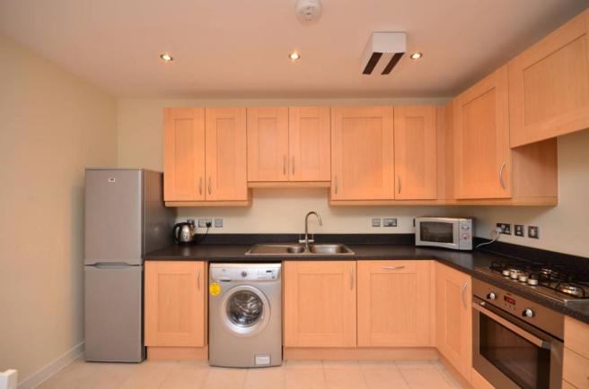 The flat is modern and the bedroom is a good size with a king size bed. There is an open plan kitchen /diner / lounge and a shared bathroom. The flat is furnished.