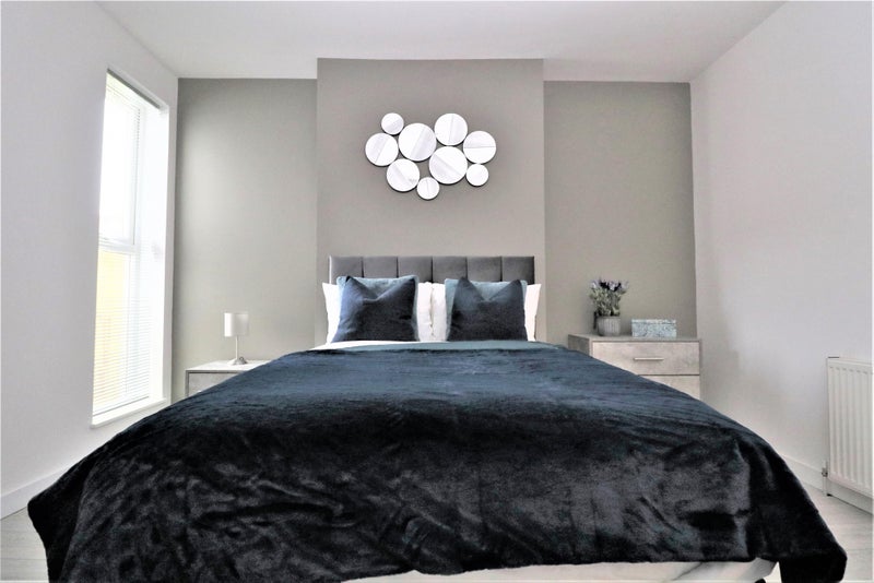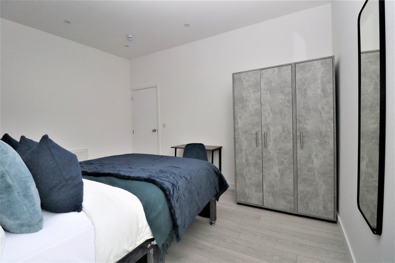 The room is a large double room, furnished with a premium divan style double bed, new pocket-sprung mattress, mattress cover, large wardrobe, chest of drawers, desk, chair and bedside table. All rooms are for single occupation only