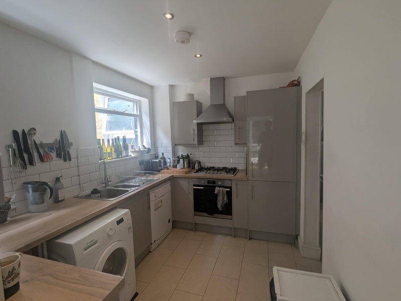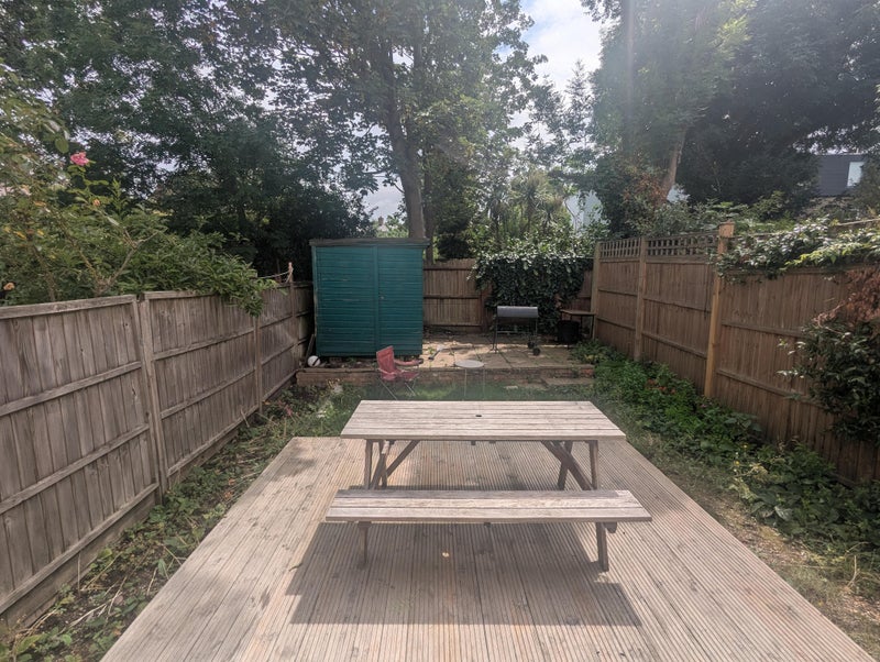 The room is a second biggest double in the house with a wardrobe, desk and cupboard space. There is also some extra storage space outside of the room. The real value of the house is the amount of shared space. There is a large office space/living room on the ground floor that fits several desks with lots of additional storage space. Adjacent the kitchen, there is a separate living/dining area that opens up onto a lovely back garden with a communal table, barbecue and storage shed. All bedrooms are on the 1st floor of the house, and we're fortunate to have two bathrooms and an additional WC. One bathroom houses our clothes dryer which is a fantastic perk during the colder months.