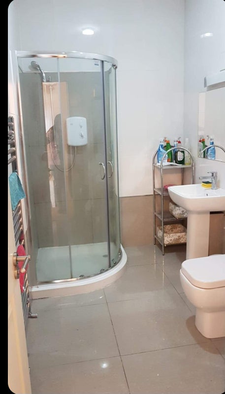 The room has its own bathroom with a shower, a very spacious wardrobe, and living room area.