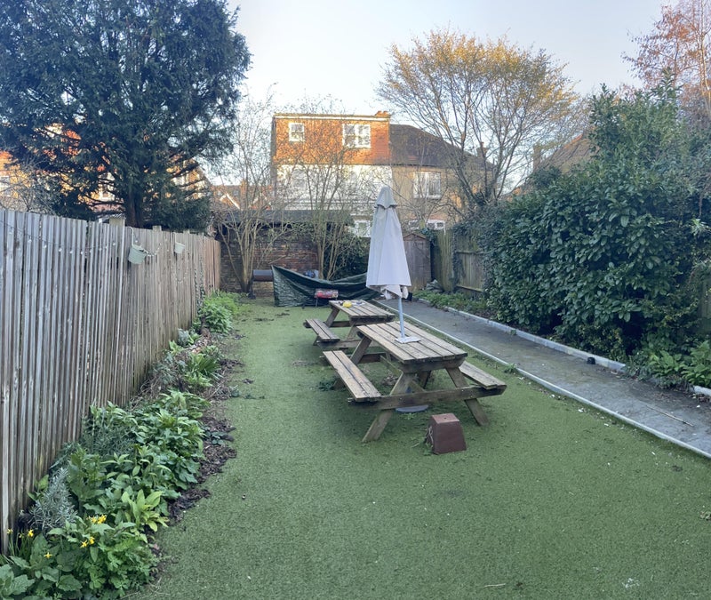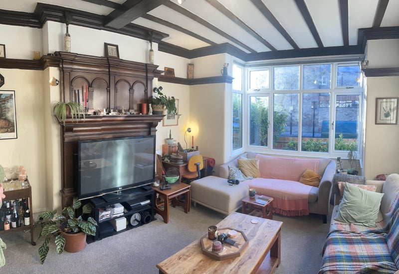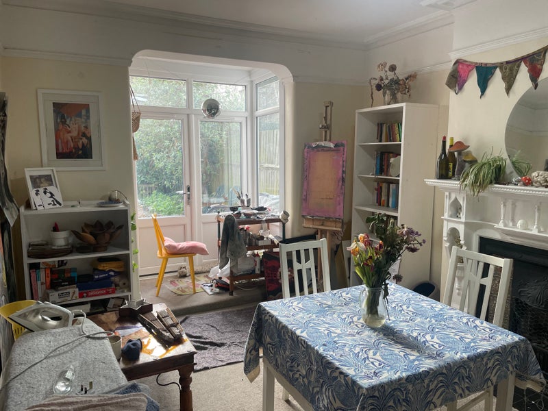 The room is around 165 sq. ft (15.4 sq m), and is at the back of the house, overlooking the garden (which is a great place for working from home in the summer or just lying in the sun). The bathroom is shared with two others. Downstairs, there is a living room, kitchen, and dining room.