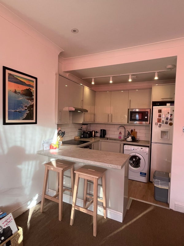 It is an open plan living room and kitchen and the bathroom has been recently renovated. It is a nice space to relax in and have a chat whilst cooking etc.