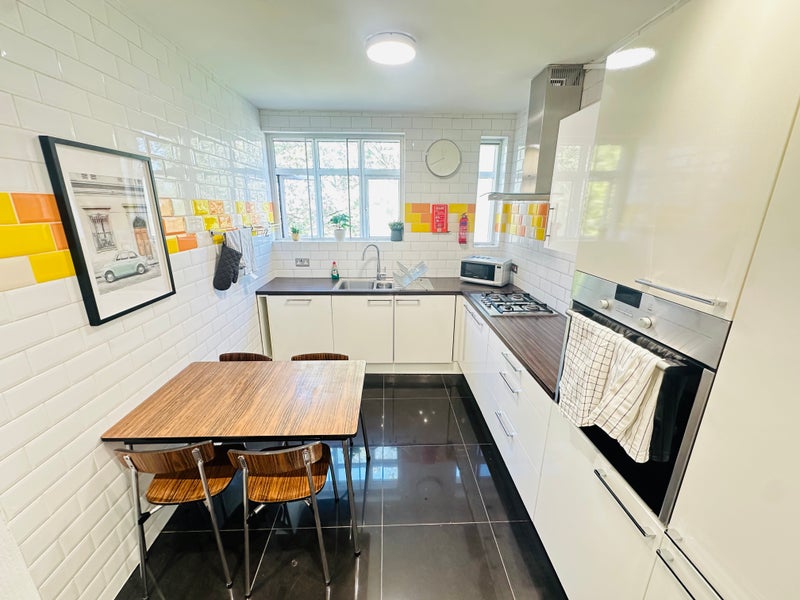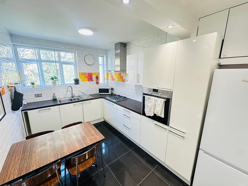 1 large double room, with a king sized double bed, desk and chair in a newly refurbished trendy bright flat in Streatham Hill. The flat has a good sized kitchen diner, with plenty of cupboard space. 1 large bathroom with an additional WC and sink and a really trendy warehouse style living room/communal space with retro games machine, 54 inch smart TV Netflix and Amazon Prime ready.