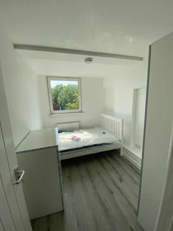Double bed, double wardrobe, chest of drawers, blackout blinds/curtains, plentiful sockets (4+) and LED strip lighting.