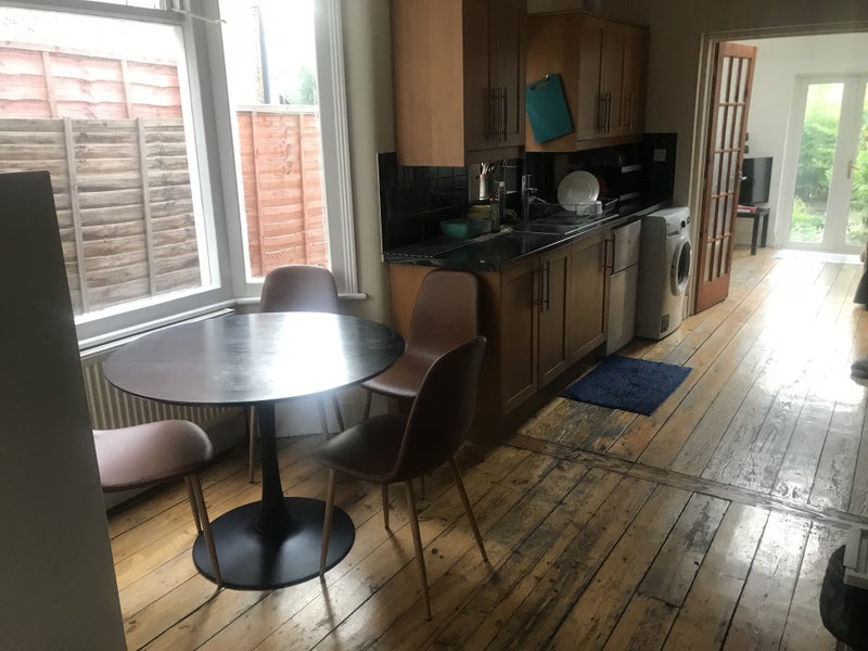 Large kitchen diner with all mod cons and separate sitting room. Own garden. Free on street parking. Park nearby. Buses 47 and 188 nearby.