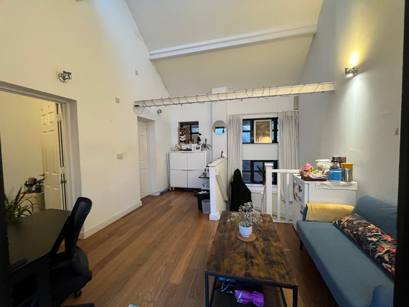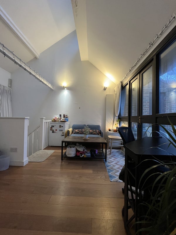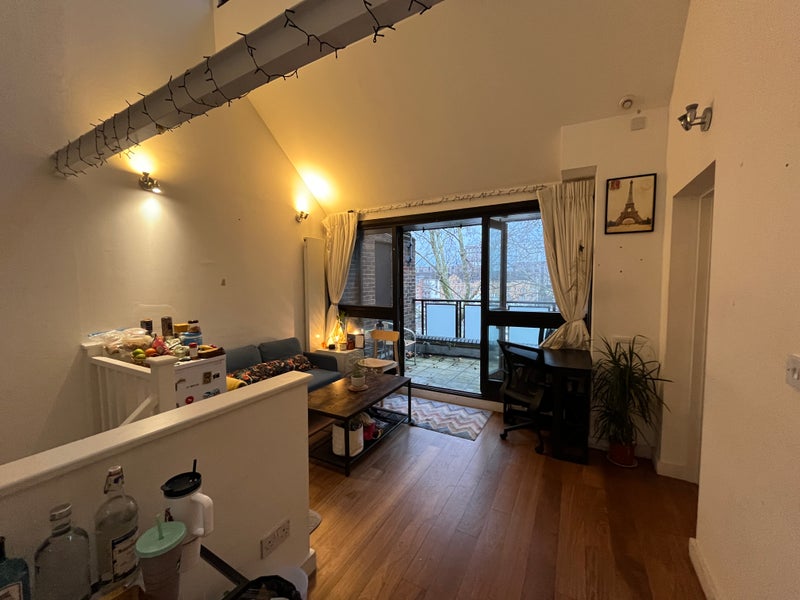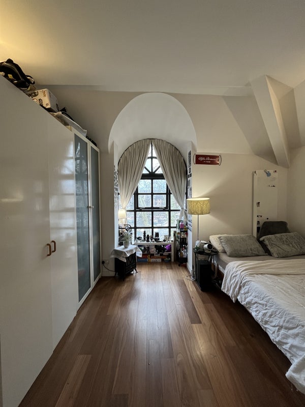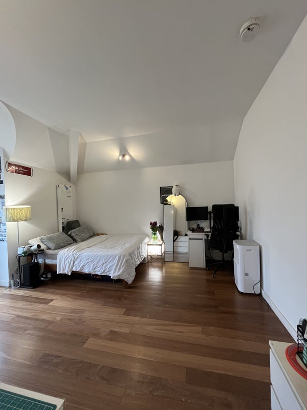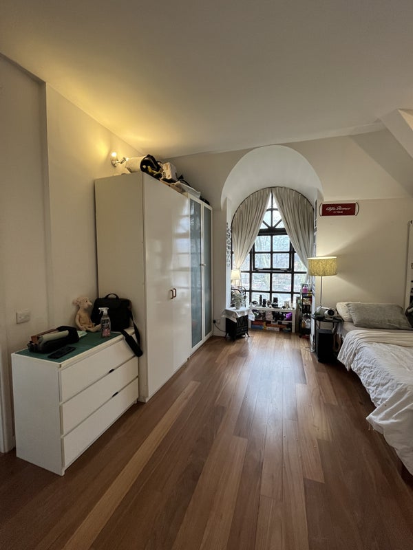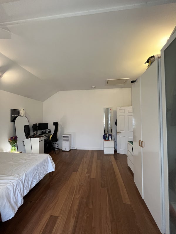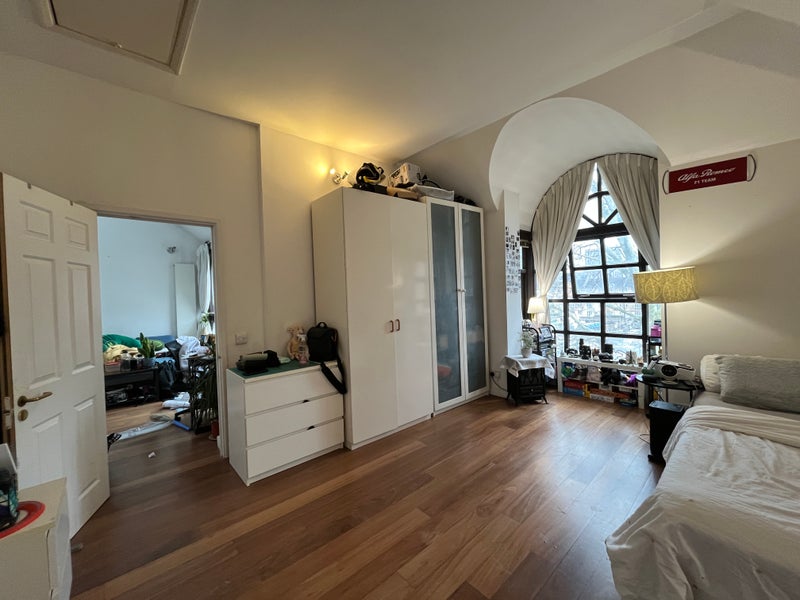 It’s a big top‑floor suite with a private bathroom, its own living area and a balcony that other housemates use only very rarely, so it feels almost like a self‑contained flat. The bedroom has wood floors, a floor‑to‑ceiling window with opening sections, two large fitted cupboards and an attic/loft directly above for extra storage.