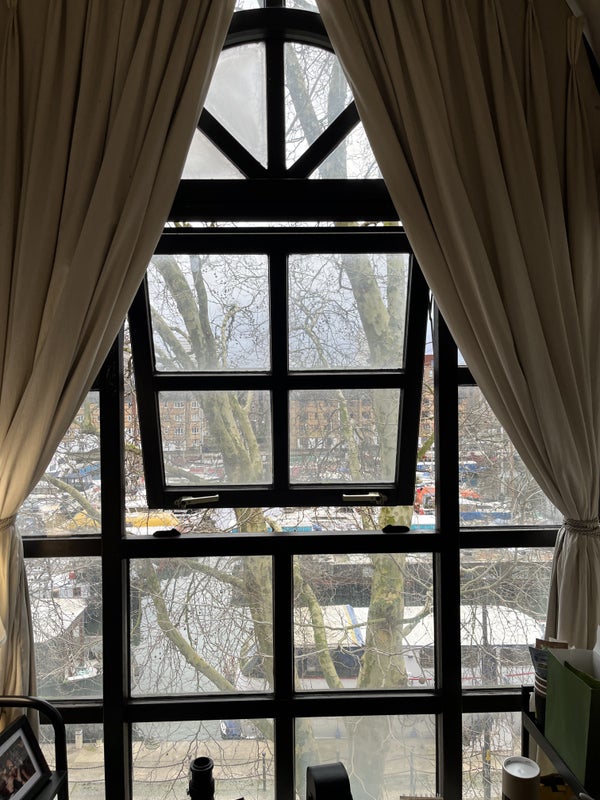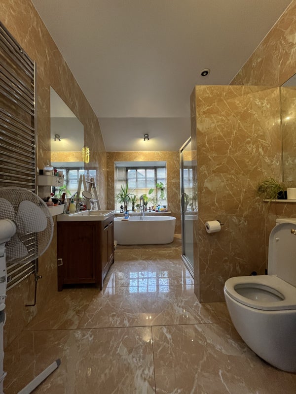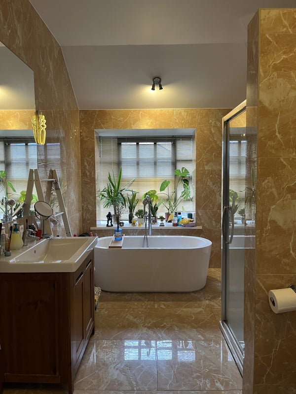 The bathroom is huge, with stone tiling, a freestanding tub, a separate shower cubicle, a large window and two mirrors. The house has one shared kitchen downstairs with four other housemates and gets good natural light and ventilation throughout.