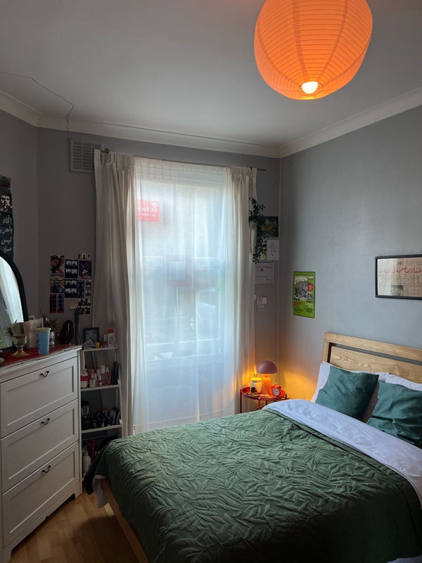 The bedroom is a good size and comes with a bed frame but is unfurnished ( potential desk, small set of drawers available too) It's at the back of the flat and is in between the kitchen and living room. It offers more privacy than the other rooms as it backs onto the flat parking lot rather than the street. The parking lot is never busy, with max 2 cars parking back there. It is surrounded with bushes and trees so it is quite peaceful!