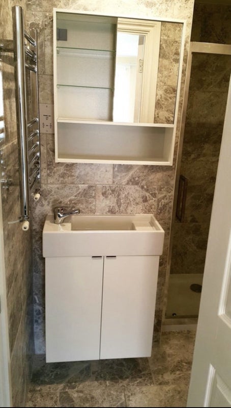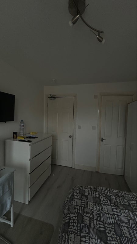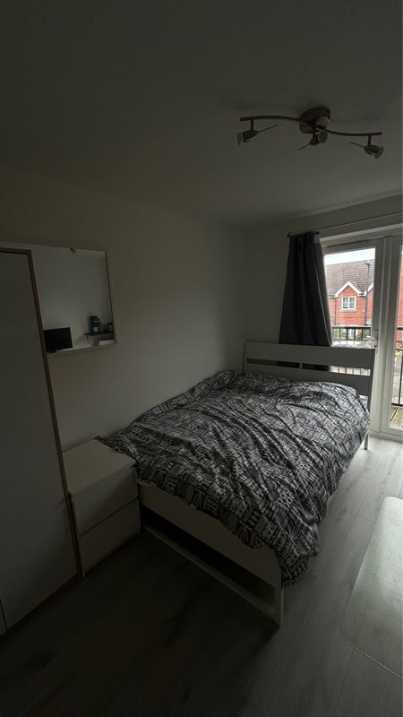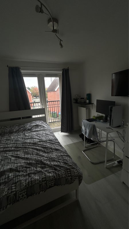 Modern en-suite double room for single occupancy with cosy bed featuring a premium orthopaedic mattress and ample under-bed storage. The room includes good-sized storage spaces and a TV for your convenience. This fully furnished room features a private balcony and is located in a warm and welcoming professional house share, perfect for those who value a clean and respectful environment.