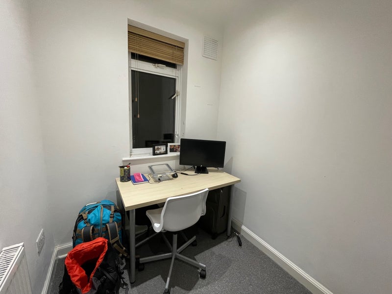 The room is furnished with a double bed, built in wardrobes, desk, chair, and chest of drawers. The office is furnished with another wardrobe, desk, and chair. There is a bathroom shared with just one other person with a large bathtub.