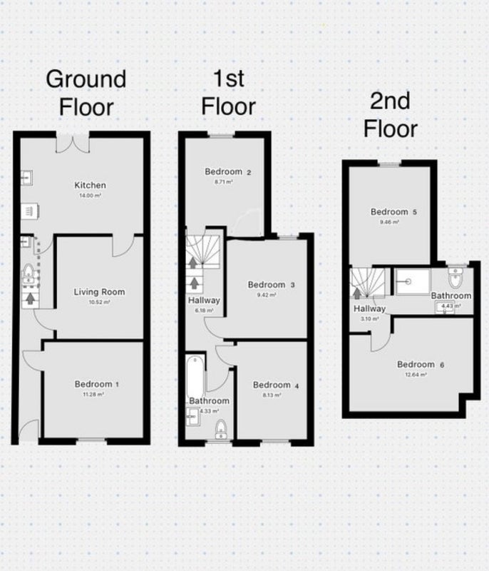 This beautifully refurbished six-bedroom house is thoughtfully spread over three floors, designed with comfort in mind. It features a spacious kitchen and living area with all appliances and utensils ready to use—ideal for meals and socialising. 🥂