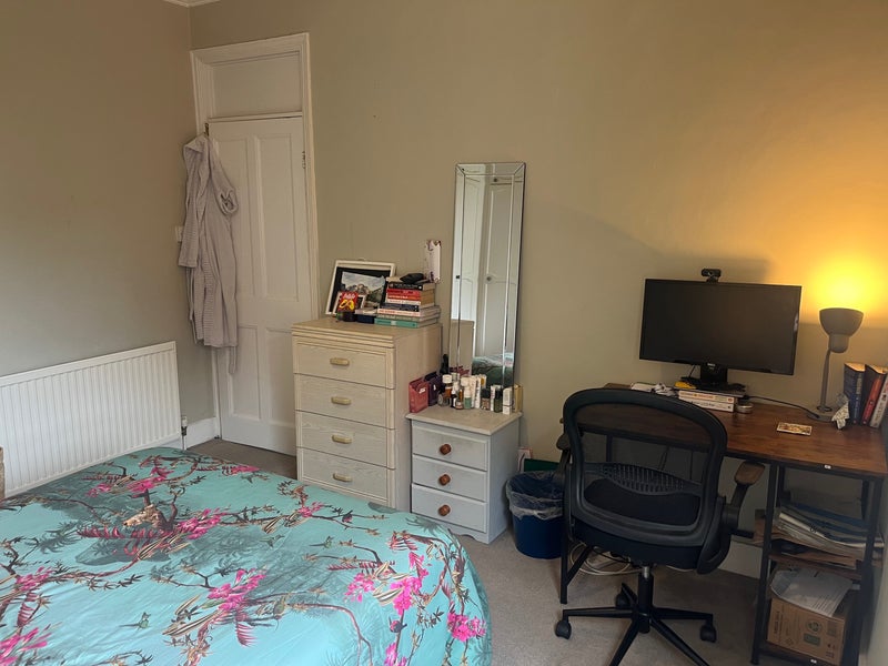The room comes furnishes with a double bed and mattress, built in wardrobes and a couple of chests of drawers. I will be taking the large white set of drawers but willing to sell the desk if the new tenant wants it .