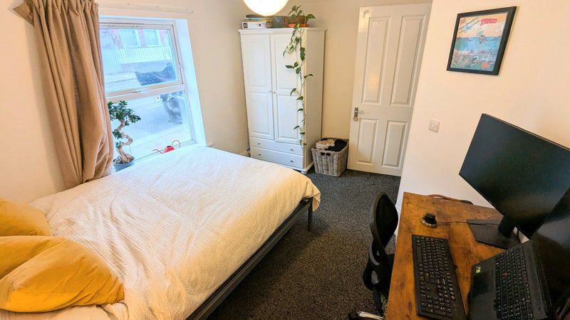 The room includes a double bed, wardrobe, chest of drawers and bedside table (no desk or desk chair). The bathroom is shared with one other person.