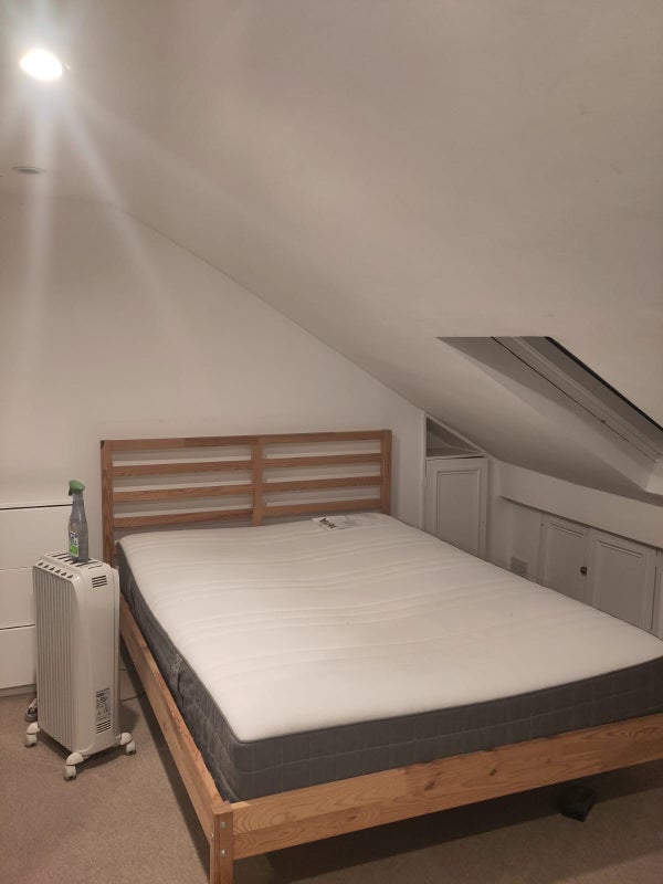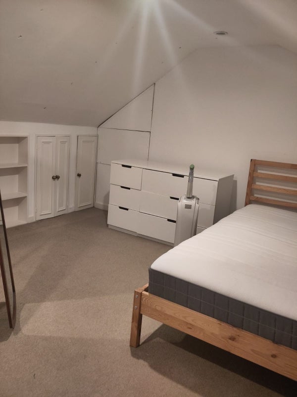The house is 3 storeys - a large lounge and a large kitchen on the ground floor with a garden. The available room is a large attic double which comes furnished. There is lots of in-room storage, with low ceilings and a half-bathroom on the same floor.