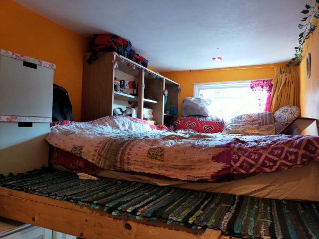 It's a funky split level design with a huge king size bed on a wall to wall platform in the air and shelves for your essentials beside the bed (it's the width of the room). There is a really big tall window so there is natural light above the bed and below, where there are more shelves, a wardrobe, drawers and a big long desk that stretches the width of the room in front of the window. So perfect for students or if you need to work from home on occasion.