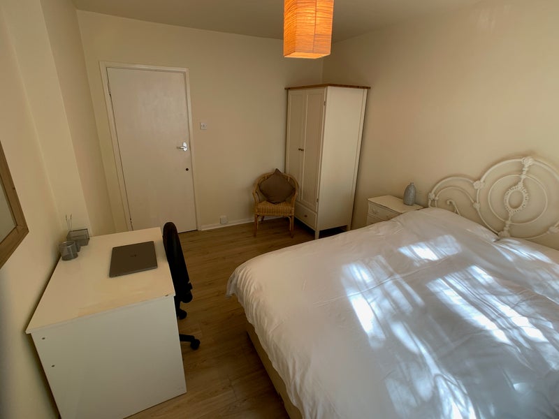 Situated in a fully furnished quiet and airy flat with excellent security, this beautiful very large double bedroom, has a new double bed and mattress. It has a lot of storage with a chest of drawers, two bedside table drawer units, a spacious wardrobe, a desk to work at and a bookcase.