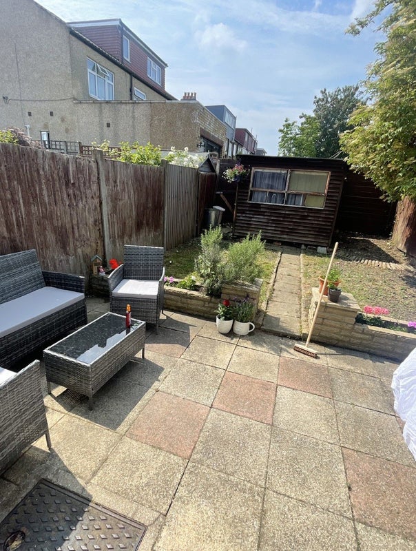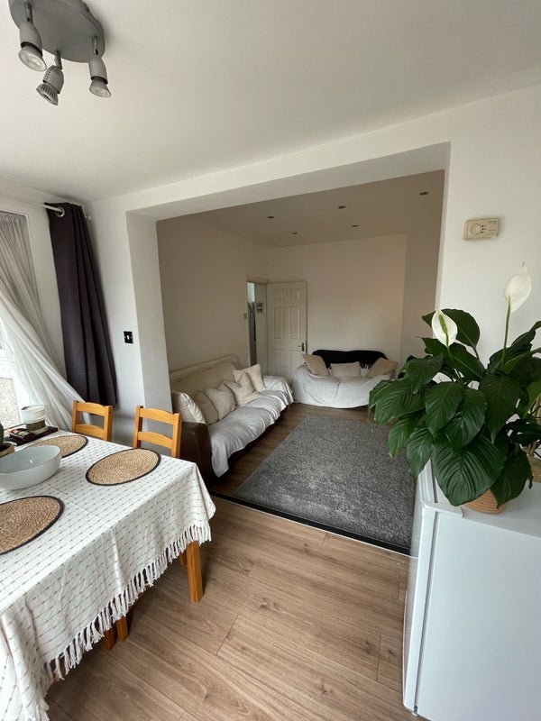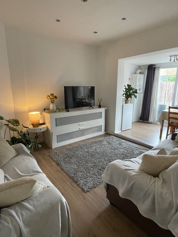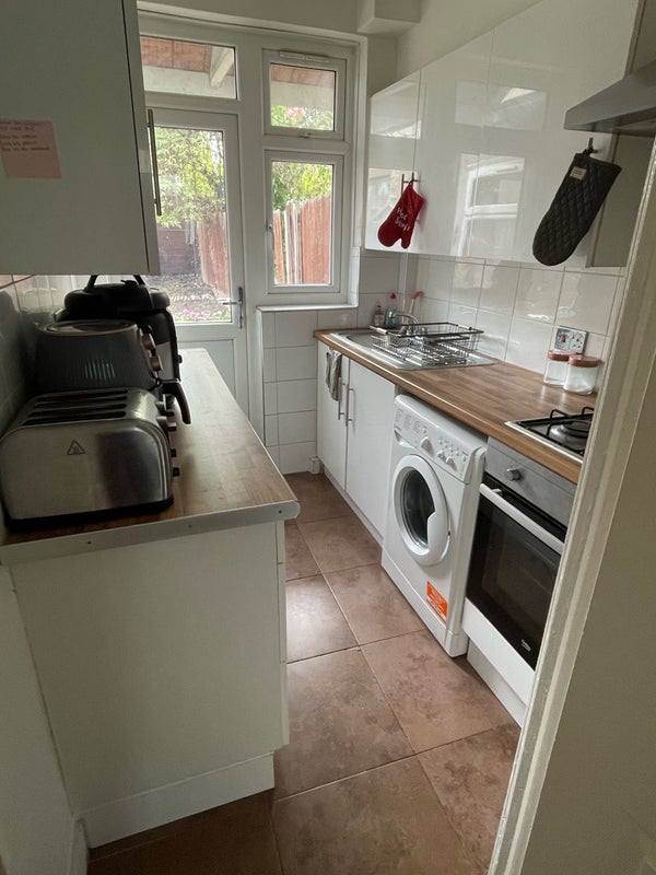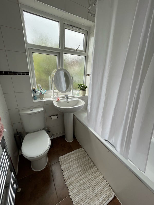 We have a decent sized living room with sliding doors that open up into the south facing garden which I am attempting to keep on top of (sometimes the weeds win). The kitchen has a gas hob and you would have your own cupboards for your kitchen bits and bobs. We have a shared bathroom between us with a bath shower.