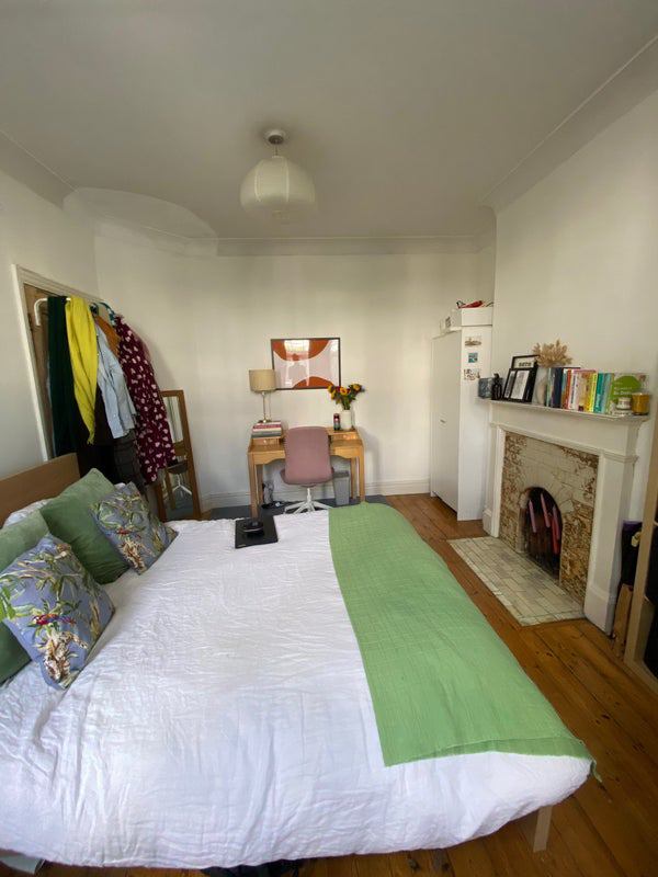 The room is partially furnished with a comfortable king-sized bed and a Kallax unit. The other furniture in the photos may available to buy from our outgoing housemate.