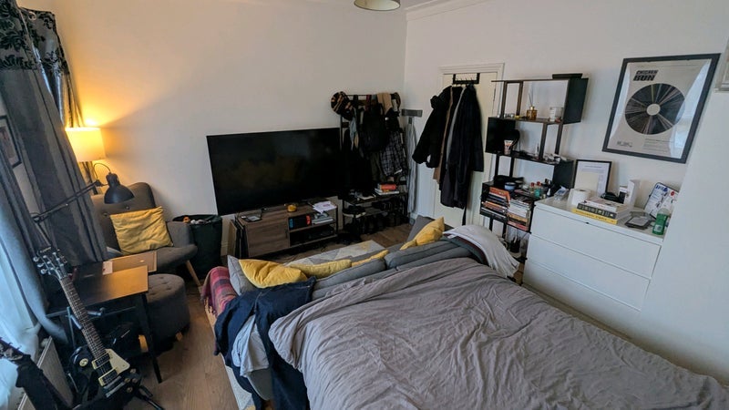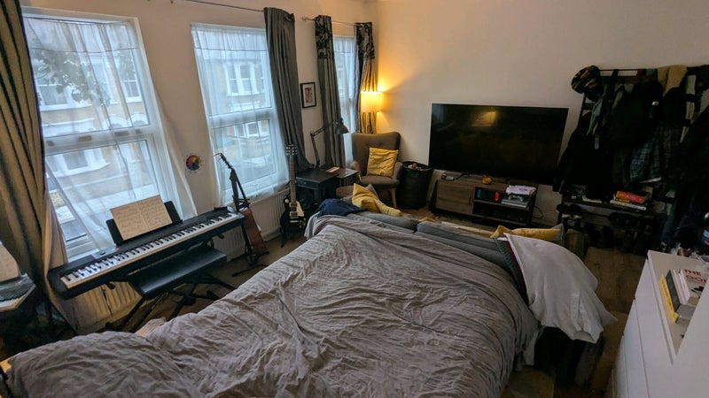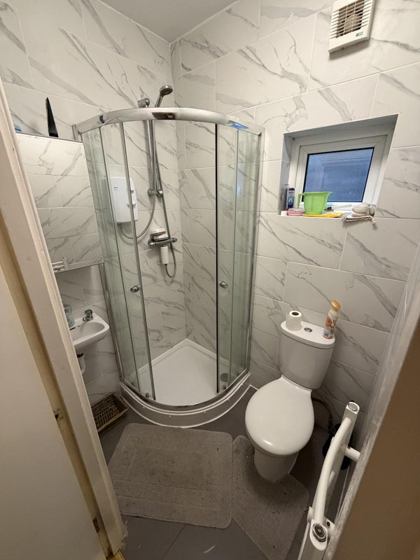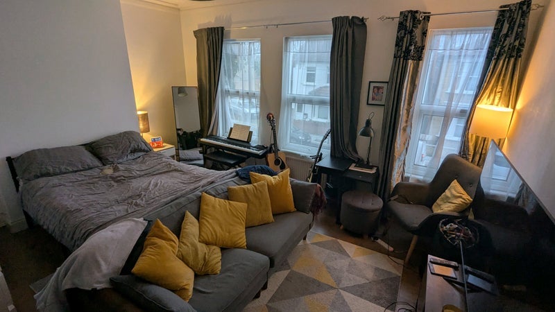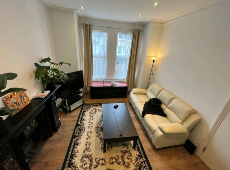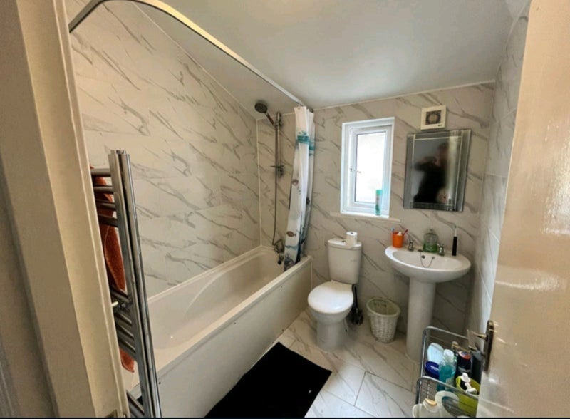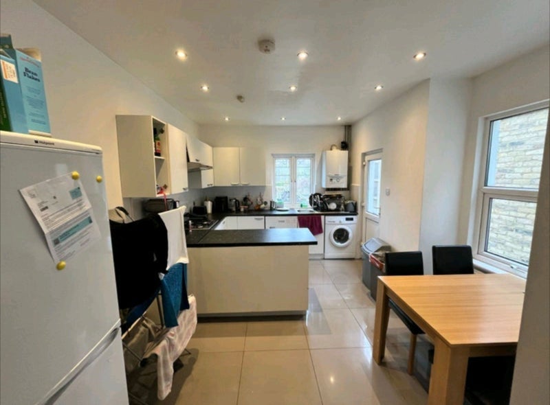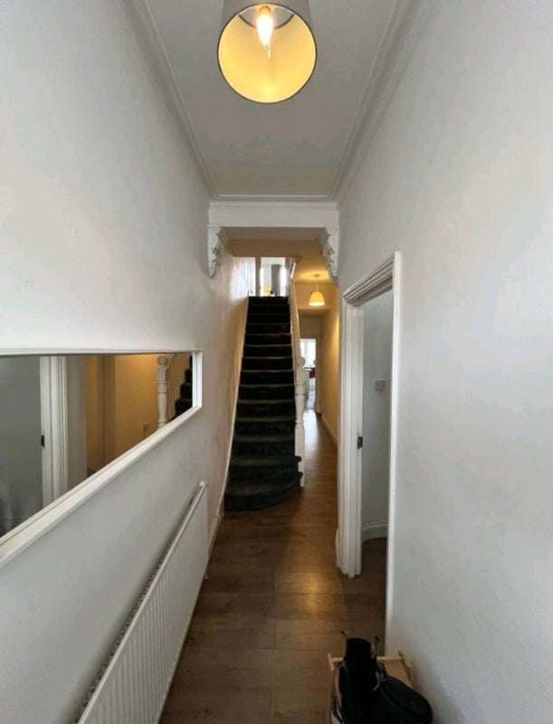 Very large bedroom in a 4 bedroom 2 bathroom house. With windows down one side with a large radiator. On a quiet street a block away from the high street.