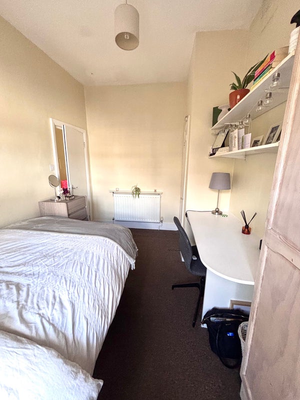 This room is on the first floor facing over the back end of the house and comes furnished. It comes with a bed, desk and chair, chest of drawers, wardrobe and shelving. There is space underneath the bed for storage.