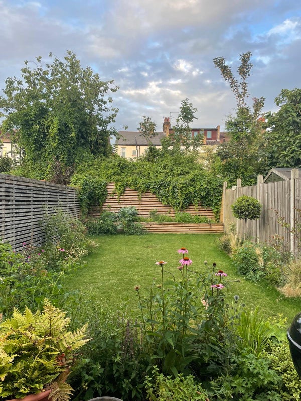 Large South facing garden equipped with BBQ, lawn mower and cooking equipment.