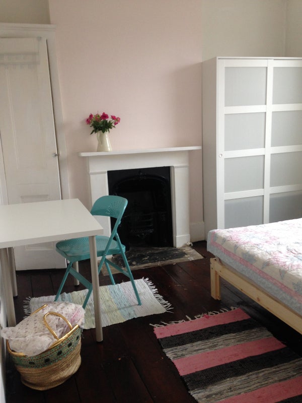 The room is garden facing, filled with light and have a feature fireplace, wooden floors, double bed, wardrobe and desk.
