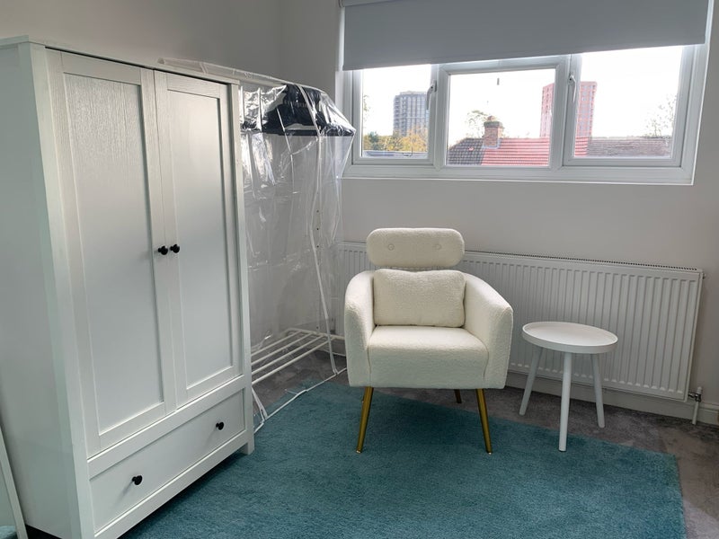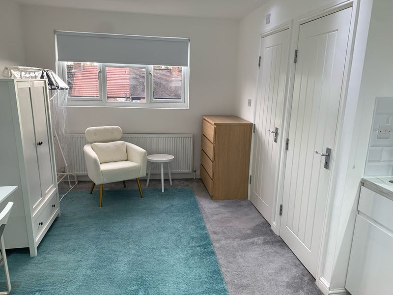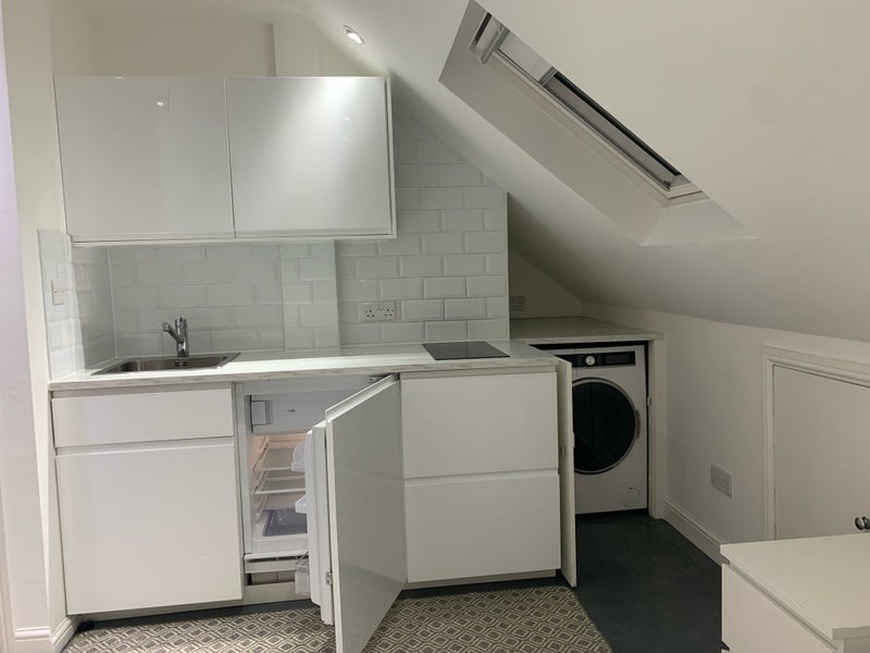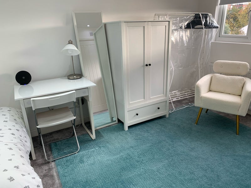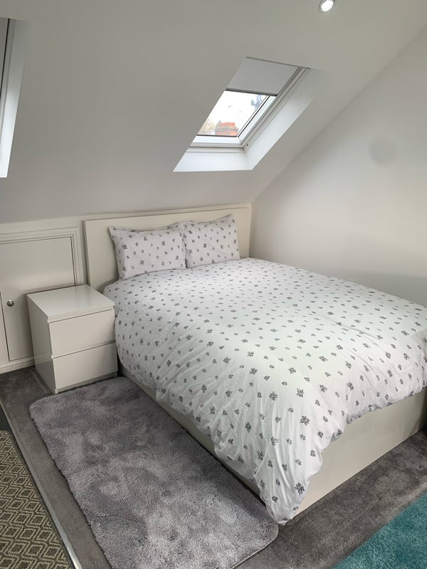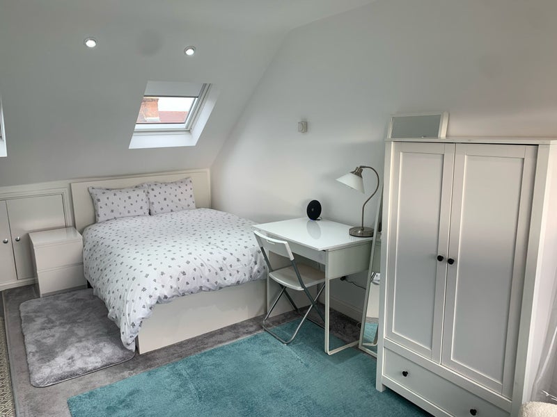 Spacious double en-suite loft room with private kitchen facilities in a quiet family home. Suitable for single occupancy.