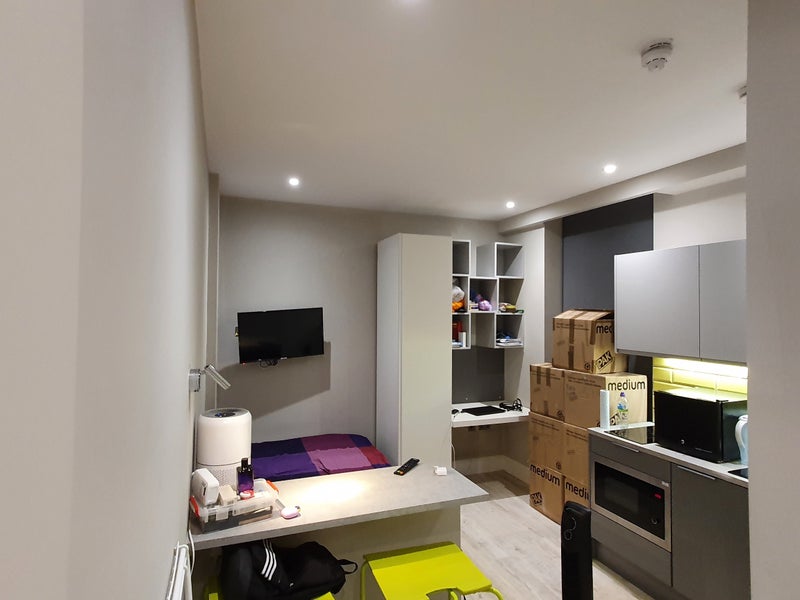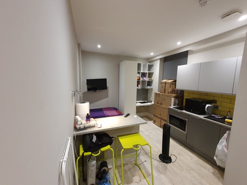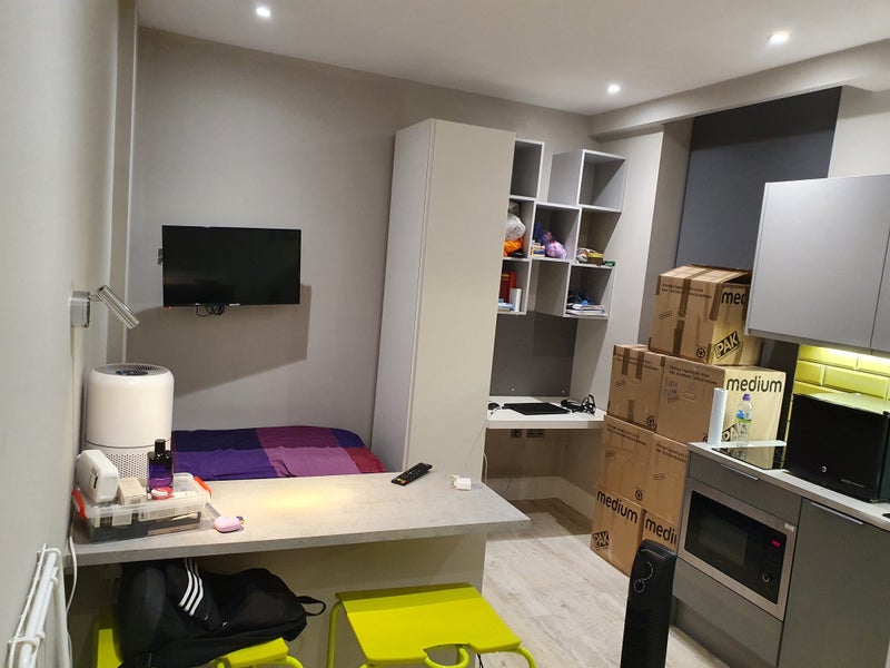 It is a one bedroom studio flat in a student accommodation building (AXO Seven Sisters) in the Tottenham Hale area (almost 10-15 min walk away from Tottenham Hale station, which has the National Rail and Victoria Line). It has its own kitchenette (sink, medium-sized fridge, and freezer drawer, electric stove, and microwave), with a communal kitchen on the same floor that has big fridges, an oven, and sinks. The studio also has its own ensuite bathroom (everything included: sink, shower and toilet). There is a mini TV in the room on one side of the bed. The bed is big and can fit two people, with a head rest. There is a study desk and an area to eat on in the room. The studio is on the highest floor, the third floor, and the view from the room is nice (you can see a big tree, some greenery and the road). The building is located near a police station so it is safe and there are many shops around, with all the grocery shops (Tesco, Asda, Aldi and Lidl) being in close walking distance and a retail park being a 10 min walk away. There is also floor heating. All bills are included (electricity, water, gas, and internet). There is a laundry room and a gym in the basement of the building, and a reception area on the ground floor at the building entrance. Only students are allowed to live there because it is a student accommodation.