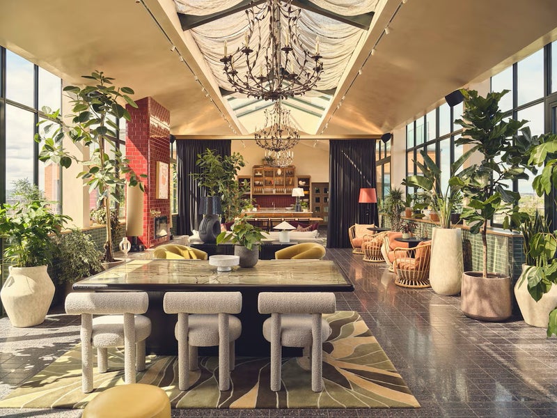 Up on the tenth floor, the orangery is a sunlit atrium that unfolds around a retro tiled hearth. With chandeliers overhead and plush rugs underfoot, residents can sink into an armchair by the fire, or set up shop for the day on a shared table with plenty of plug sockets. Designed to flex for every need, this space can be connected to a commercial-grade chef’s kitchen and table, expertly kitted out for caterers or big names stopping by to run a supper club. A range of private dining rooms on this floor are bookable for birthdays and gatherings that require a little extra fanfare.