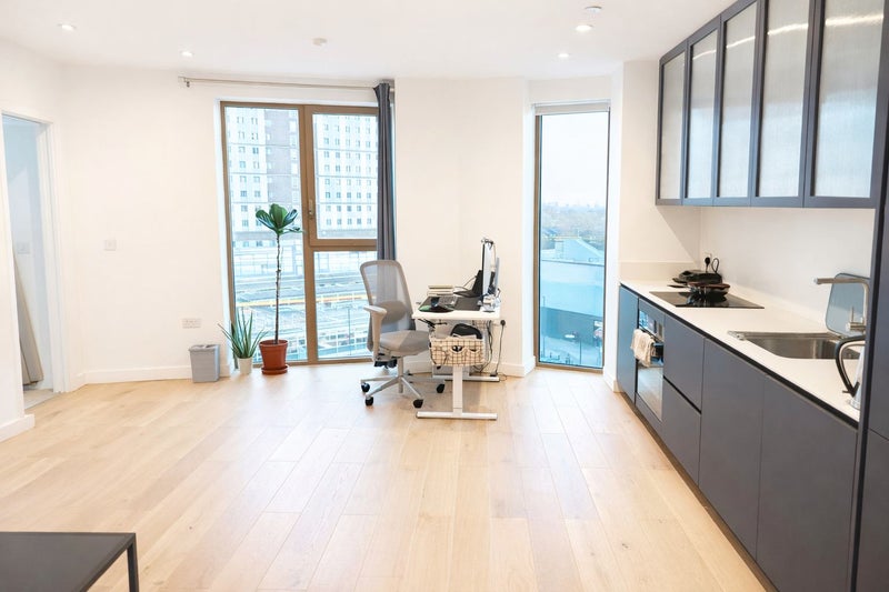 Bright, minimal 1-bedroom flat on the 4th floor of a modern building at 1 Ashley Road, directly above Tottenham Hale station. Big windows, open London skyline views, and fully furnished throughout.