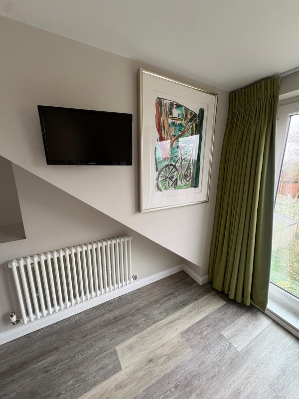 Large furnished room with king sized bed with new firm mattress and plenty of wardrobe & draw storage space. It has a large shower ensuite and underfloor heating. The glass faux balcony has a view across the park. The northern line station is a 12-15 minute walk through the park. It is quiet a beautiful. I have a friendly dog living in the house.