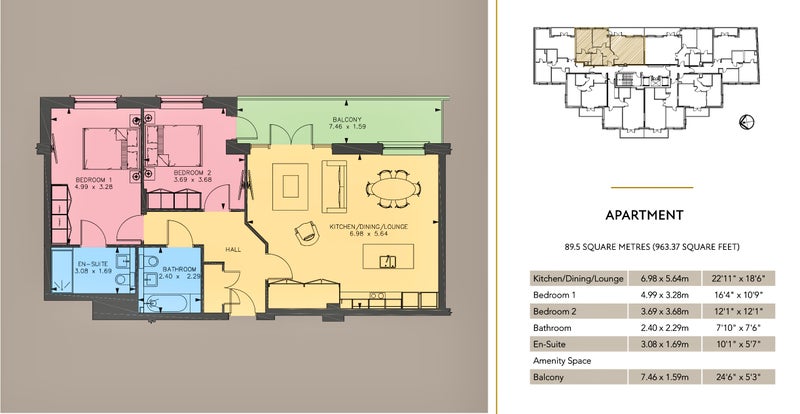 The apartment has two bedrooms, two bathrooms, living room with balcony.