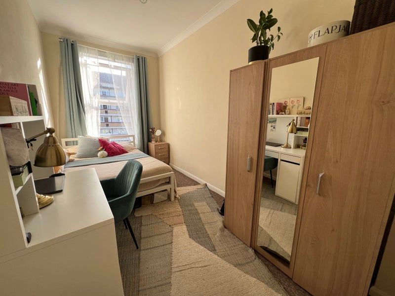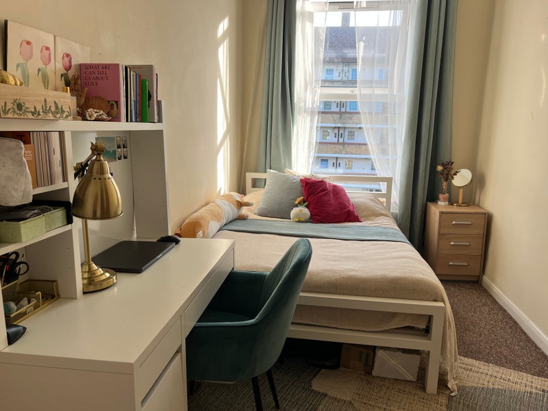 First photos - is your bedroom. It will be freshly repainted before your move in and I’m currently negotiating a bigger wardrobe for you, but can’t promise yet (fingers crossed).The decorations on the photos are my sister’s - so you will have a bed with a mattress, a desk(the fate of chair is undecided yet), a wardrobe, a bedside table and we are keeping the carpet and curtains. If you wish to have a different layout of furniture - it could be arranged before you move in.
