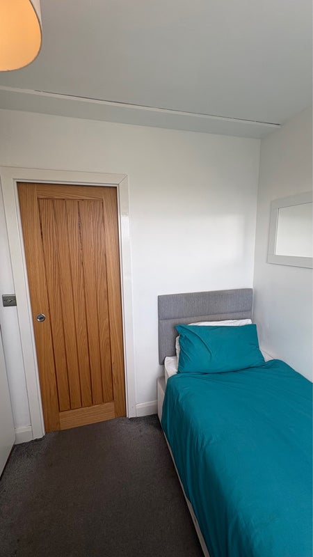 The room is neat & comes with a single bed with draws, plus a cupboard & wardrobe.