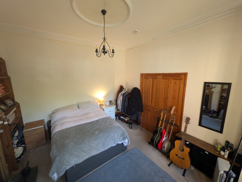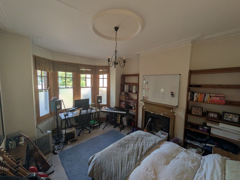 Large room with loads of natural light and a fireplace. Comes with Bed frame and cupboards for storage.