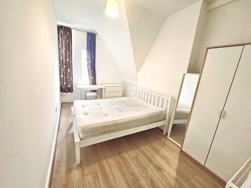 A bright and fully furnished double room is available just a 5-minute walk from Turnpike Lane Station (Piccadilly Line, Zone 3). The room comes with a comfortable double bed, wardrobe with mirror, chest of drawers, and a desk and chair—perfect if you work or study from home. Large windows allow for plenty of natural light, and the wood flooring gives the space a clean, modern feel.