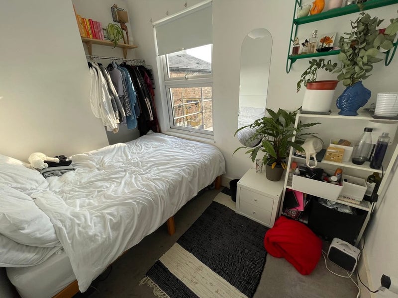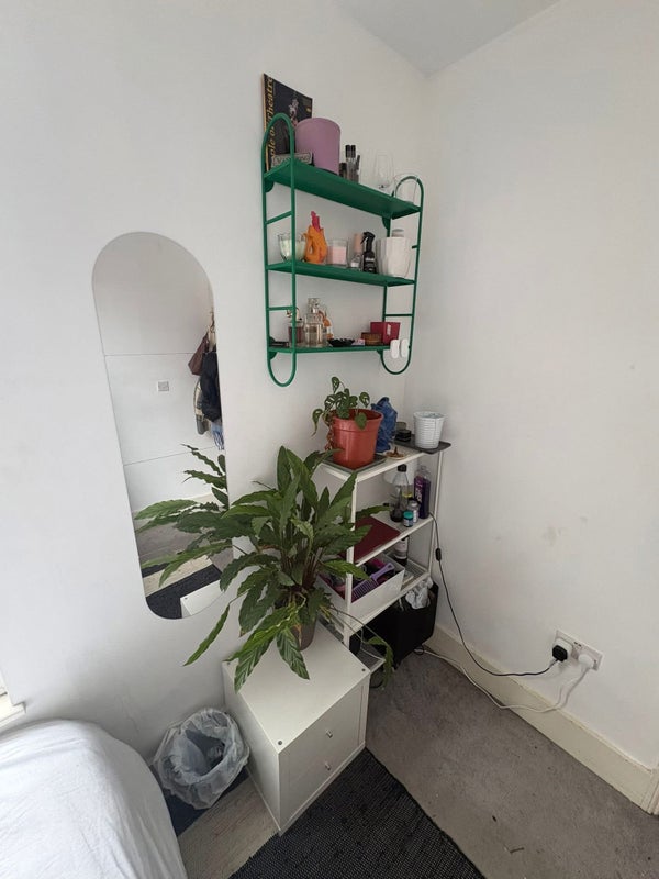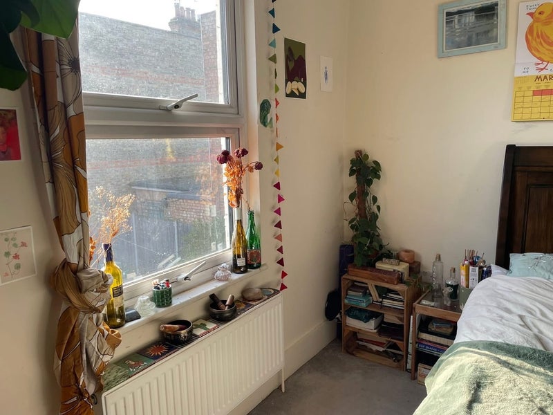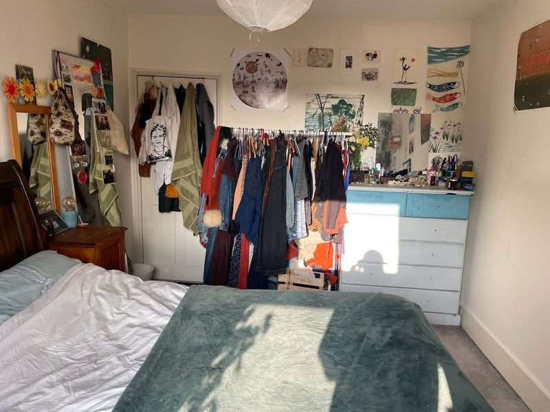 The bedroom is south facing, gets plenty of light and looks onto the garden. Comes with a bed frame (not the one in the pic, but the frame pictured in the smaller studio room, the frame is smaller so it takes over the room less), a chest of drawers (pictured) and the clothes rail if you want it! It’s a medium sized double, next to the bathroom which has a bath and shower, which you’d only be sharing with one other person, as there is one bedroom with an en-suite and another with a w/c next to it downstairs.