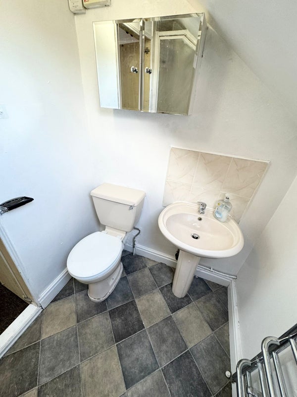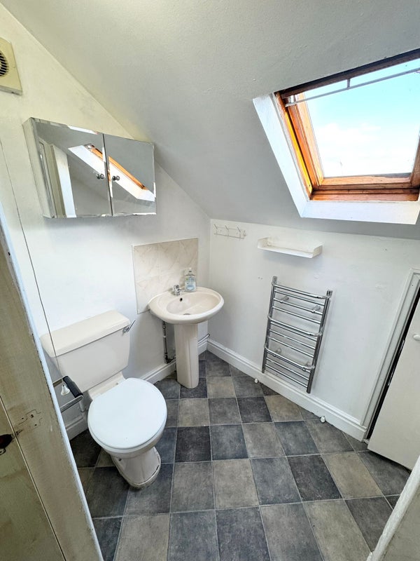 The studio also benefits from its own en-suite bathroom with a toilet, sink, and heated towel rail.