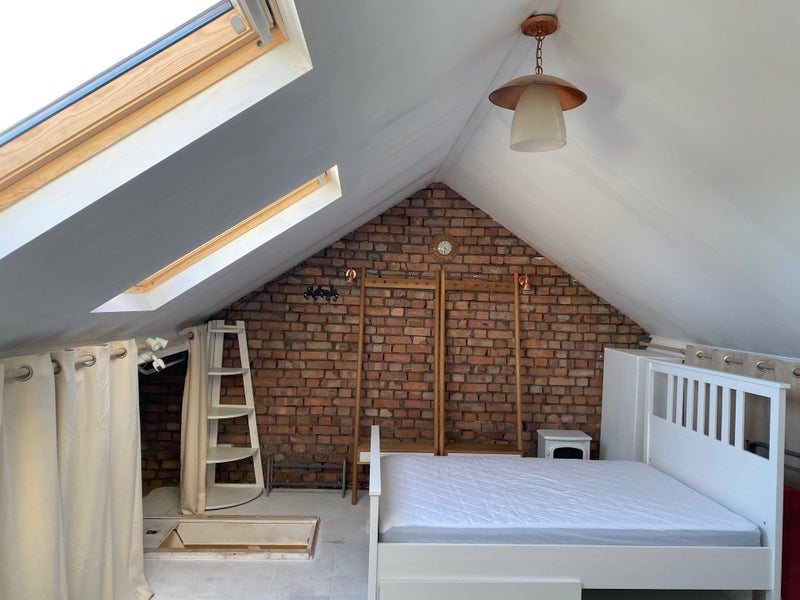 Renovated very spacious loft / attic room (entire width of the house) with new furniture available, preferably for single female professional. The whole house has undergone a massive refurbishment and two new bathrooms. Big south facing sunny garden and patio. The house is located in a quiet residential area with two nearby huge parks for jogging/cycling/tennis.
