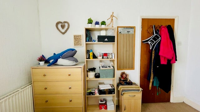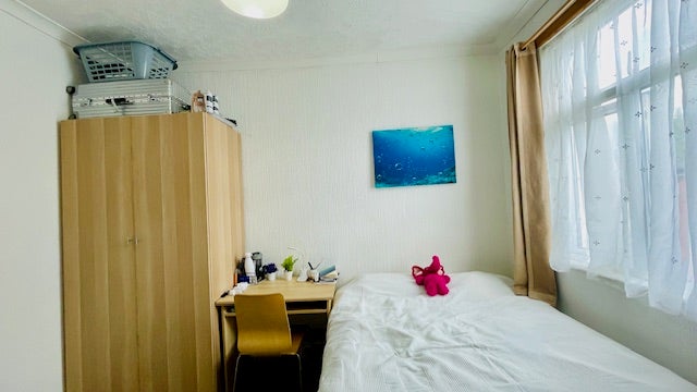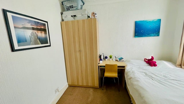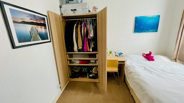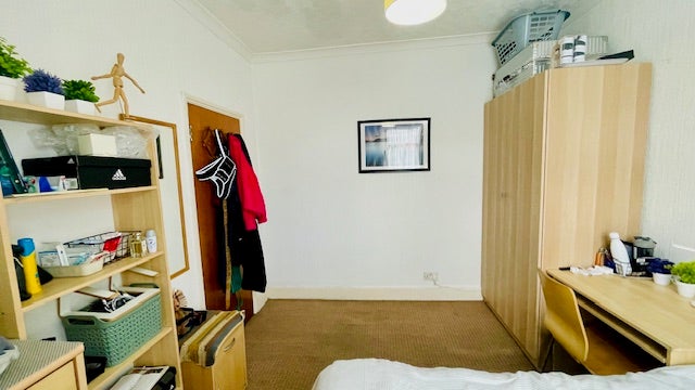 The room is spacious and comes fully furnished: double bed, huge double wardrobe, chest of drawers, desk with chair, standing book shelves etc