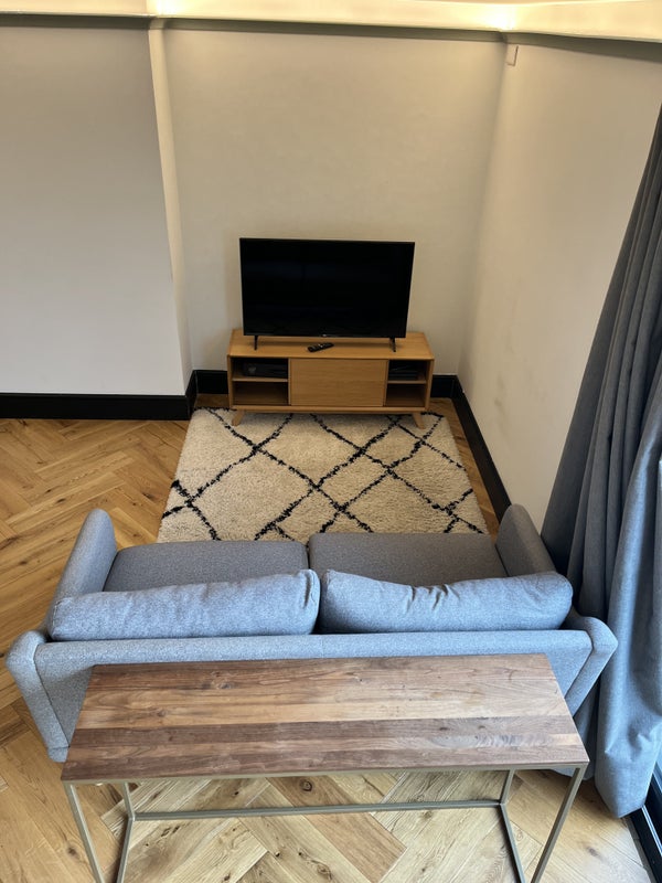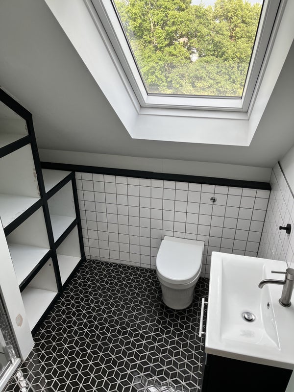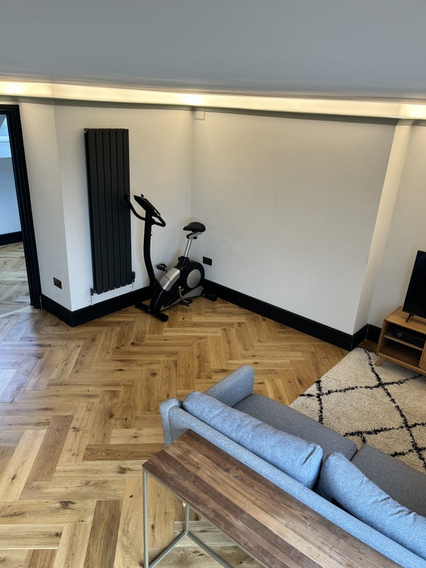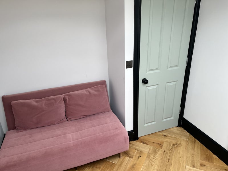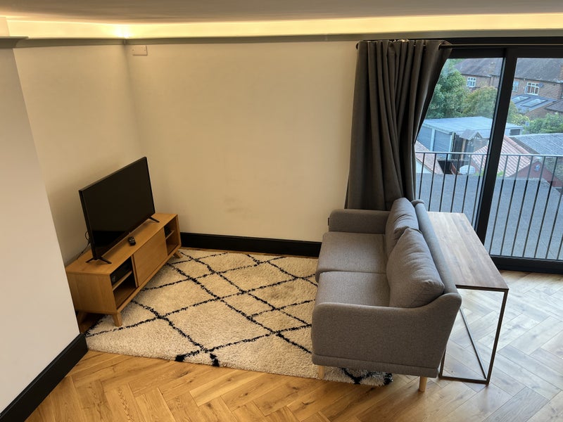 This is a large self contained flat in the top floor of a quiet family home (shared entrance). One double bedroom, a large shower en-suite and a beautiful bright living room with kitchenette and a Juliette balcony. Hard wooden chevron floors in a newly built loft conversion. Semi furnished with sofa, tv and tv console and a sofa bed.
