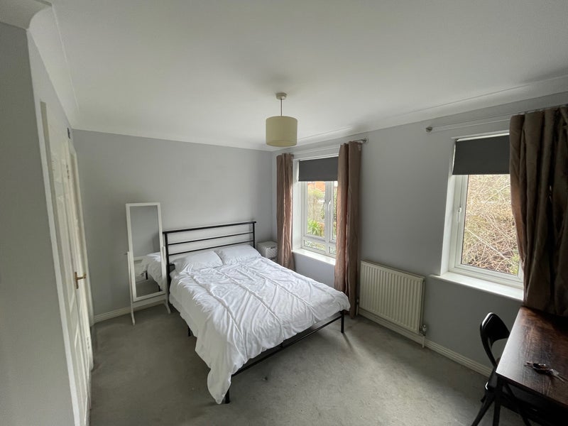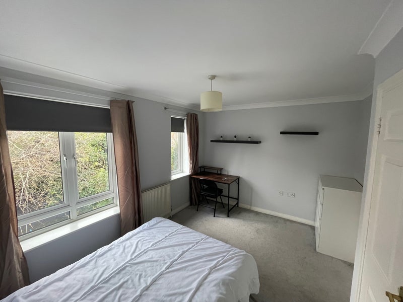 The room is spacious and furnished with a double bed, built in storage, set of draws, private bathroom, desk and chair.