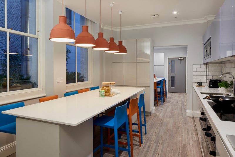 There is a large kitchen shared with 21 students. There are 4 fridges, 4 freezers, ovens, microwaves, stoves and an assigned cupboard (more are available).