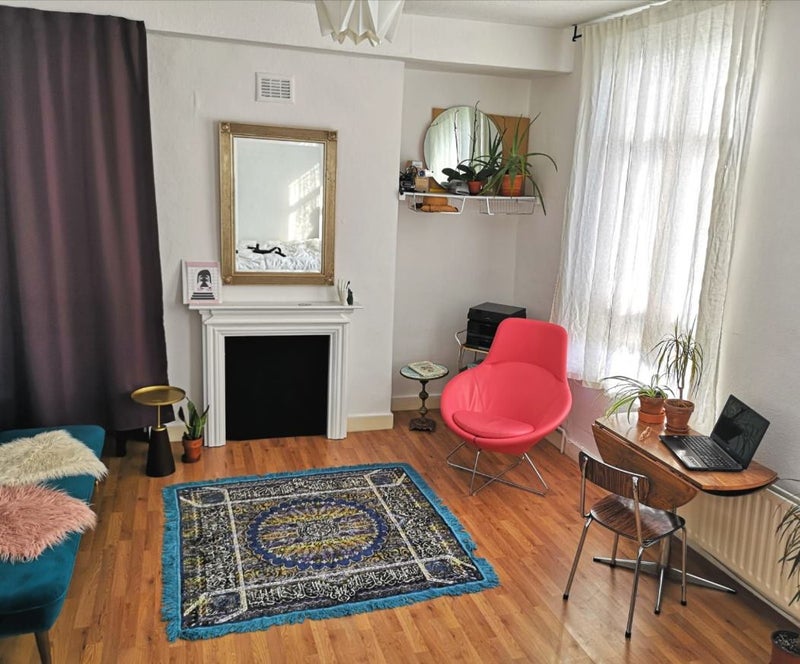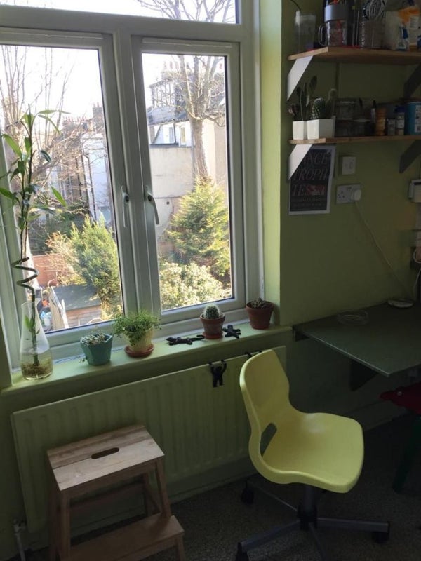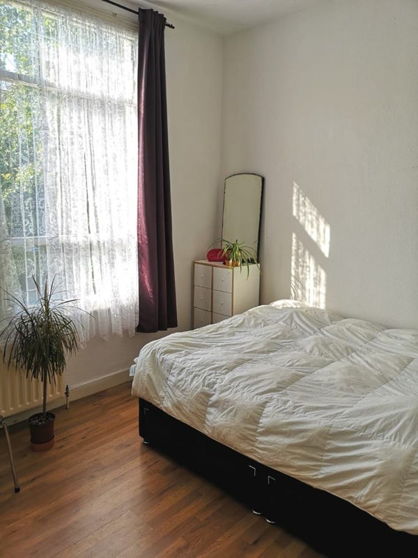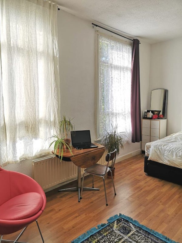 A bright & super spacious room in Victoria Park, Hackney available Mon-Fri from April 1st. Occupying the first floor of a Victorian flat, the room used to be the living room of the flat, so it's massive. It is fitted with modern & antique furnishings and a very relaxing king size bed with comfy mattress. At the same floor there is the shared large bathroom and the kitchen. On the second floor there are two other rooms. It has a sense of studio as it is the only room on the floor with direct access to kitchen and bathroom. The rent is £950 incl. bills.